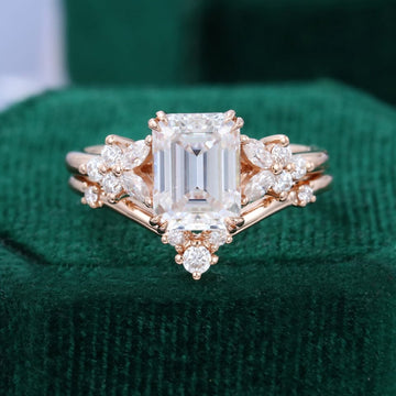 Emerald Cut Moissanite Wedding Ring Set Floral Vibe Ring Set