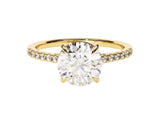 Refined and dazzling, this moissanite engagement ring in 14k gold features 14 brilliant side stones on its band that complement your round center stone.