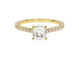 The Cushion Cut Moissanite Engagement Ring with Pave Set Side Stones is a captivating and luxurious symbol of love and commitment. This exquisite ring features a stunning cushion-cut moissanite at its center, known for its square or rectangular shape with rounded corners and brilliant facets that create a captivating play of light. The side stones add a touch of glamour and enhance the overall beauty and brilliance of the ring.