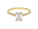 Experience regal beauty with our Emerald Cut Moissanite Engagement Ring featuring Pave Set Side Stones. This captivating ring showcases a magnificent emerald-cut moissanite center stone, celebrated for its timeless elegance and brilliance. The band is gracefully adorned by smaller moissanite stones, meticulously set in a pave style, creating a spectacular display of shimmer and opulence.