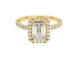 The Emerald Halo Moissanite Engagement Ring is a truly enchanting and opulent symbol of love and commitment. At its heart, this exquisite ring features a brilliant emerald-cut moissanite, celebrated for its rectangular shape and dazzling sparkle. What sets this ring apart is the exquisite combination of a halo setting and pave-set side stones.