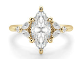 An elegant design featuring a bold center stone complimented by two marquise accents and a dainty round cut stone on each side.| METAL DETAILS |