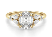 Elegant and charming, this moissanite engagement ring in 14k gold features a cluster of 6 marquise-shaped sparkling stones to complement your oval-shaped center stone.| METAL DETAILS |
