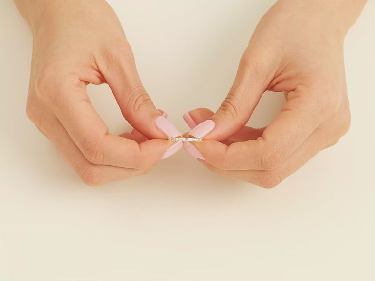 This modern and elegant band showcases the beauty of horizontally set baguette cut moissanites that reflect a rainbow-like light that catches every eye. It is perfect for adding a modern glam to your special days and every day beyond.