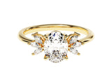 Elegant and charming, this moissanite engagement ring in 14k gold features a cluster of 6 marquise-shaped sparkling stones to complement your oval-shaped center stone.| METAL DETAILS |