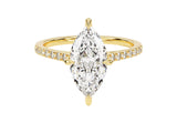 Experience the radiance of luxury with our Marquise Cut Moissanite Engagement Ring featuring Pave Set Side Stones. At its core is a dazzling marquise-cut moissanite known for its exquisite brilliance and charm. The band is elegantly embraced by smaller stones, meticulously set in a pave style, creating an enchanting play of light and sparkle.
