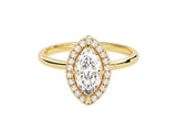 The Marquise Halo Moissanite Engagement Ring is a stunning and timeless symbol of love and commitment. At its heart, this exquisite ring features a brilliant marquise-cut moissanite, renowned for its elongated, boat-like shape with pointed ends and remarkable brilliance. Its halo setting, which encircles the central moissanite with a shimmering array of smaller stones, adds a touch of classic elegance to the overall design.
