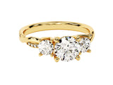 Perfect and graceful, this moissanite engagement ring in 14k gold features two brilliant side stones and pave set of moissanites to complement your round-shaped center stone.