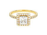 The Princess Halo Moissanite Engagement Ring with Pave Set Side Stones is a mesmerizing and opulent symbol of love and commitment. At its core, this exquisite ring features a brilliant princess-cut moissanite, renowned for its square shape and extraordinary brilliance. The central princess moissanite is elegantly encircled by a halo of smaller stones, creating a radiant and captivating aura around it. Along the band, tiny moissanite stones are meticulously set using the paving technique, adding an extra layer of sparkle and sophistication.