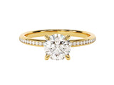 A round cut moissanite engagement ring with channel set sidestones featuring a 1.00 ct center stone is a stunning choice that elegantly combines classic design with modern sophistication. The channel setting adds a sleek and seamless look, enhancing the overall brilliance of the ring.