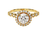 A round halo with marquise sidestones moissanite engagement ring featuring a 1.00 ct center stone is a stunning and unique choice that combines classic elegance with a distinctive flair. The marquise sidestones add an eye-catching touch that beautifully complements the round halo.