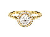 The Twisted Halo Moissanite Engagement Ring features a captivating design centered around a 1.00-carat moissanite gemstone. This ring showcases a twisted halo setting, where the band intricately weaves around the center stone, enhancing its brilliance and sparkle.