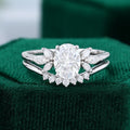 The White Gold Oval Cut Moissanite Wedding Set is a stunning and elegant bridal set that features an oval cut Moissanite as the center stone, set in a beautiful white gold band. This set offers a balance of timeless beauty and modern sophistication, perfect for those seeking a high-quality, ethical, and affordable engagement ring and wedding band.